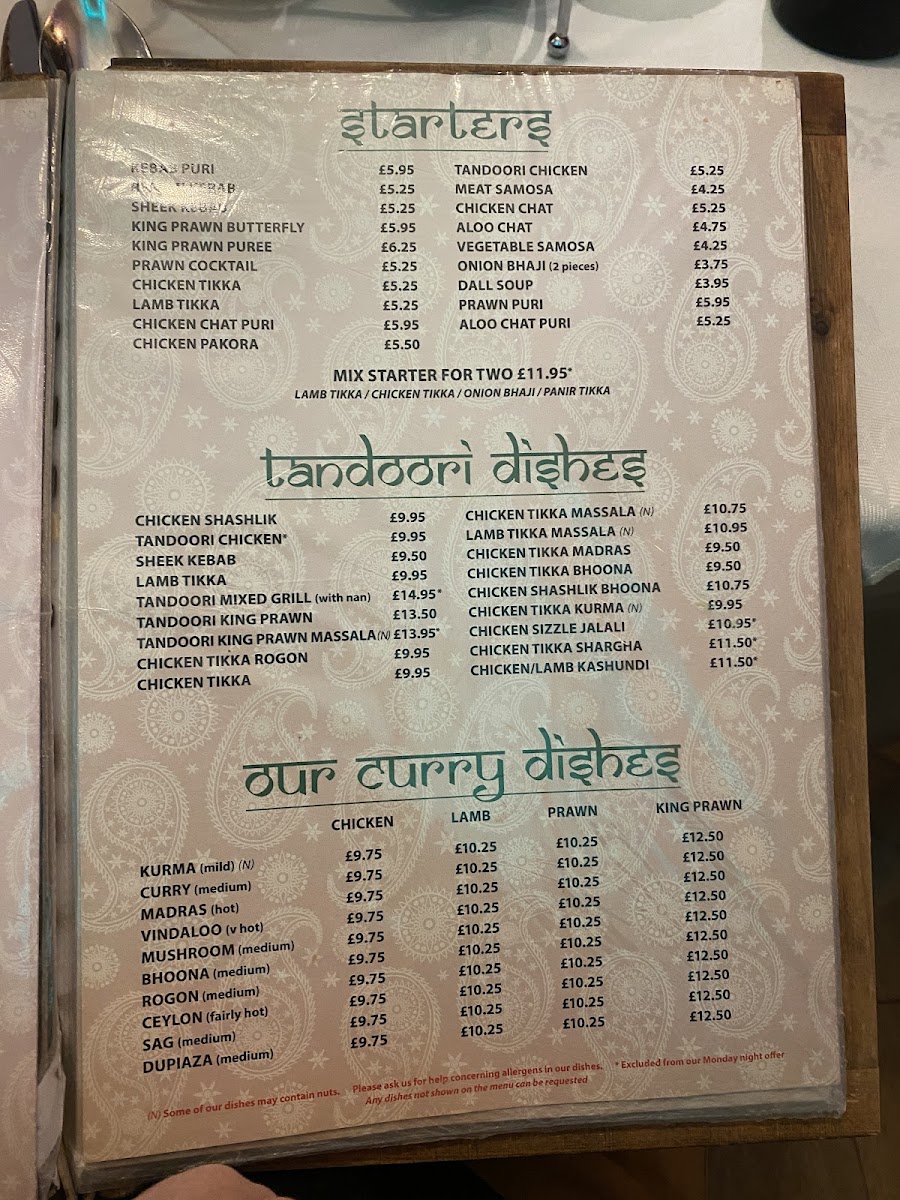 As you scan through, you’ll notice a mix of vibrant starters that wake up your taste buds before easing into rich, aromatic mains layered with depth and warmth. There’s a satisfying balance here - fiery dishes for those who like a kick, alongside milder, creamier options that don’t hold back on flavour. And then come the sides: fluffy rice, freshly baked breads, and little extras that somehow make the whole experience feel complete.